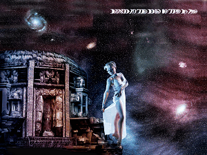 Mounted and framed, this image depicts a beautiful dancer high up on a mountain with a celestrial cosmos behind her. The image is 8x6 inches in a glass surfaced double-mounted frame measuring: 16.5 x 11.7 inches.