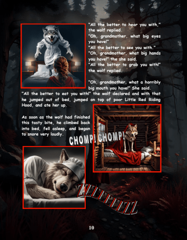 10\the wolf replied.\you have!\\\you have!\\the wolf replied.\big mouth you have!\\he jumped out of bed, jumped on top of poor Little Red Riding Hood, and ate her up. As soon as the wolf had finished this tasty bite, he climbed back into bed, fell asleep, and began to snore very loudly.