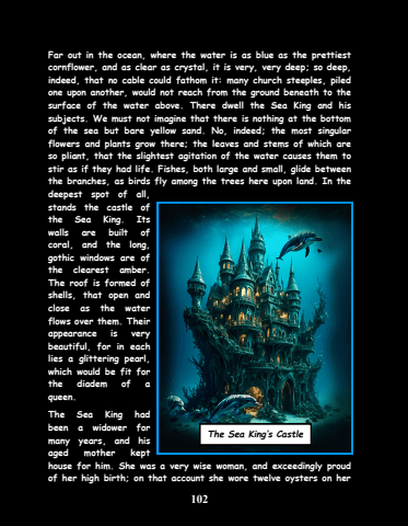 102Far out in the ocean, where the water is as blue as the prettiest cornflower, and as clear as crystal, it is very, very deep; so deep, indeed, that no cable could fathom it: many church steeples, piled one upon another, would not reach from the ground beneath to the surface of the water above. There dwell the Sea King and his subjects. We must not imagine that there is nothing at the bottom of the sea but bare yellow sand. No, indeed; the most singular flowers and plants grow there; the leaves and stems of which are so pliant, that the slightest agitation of the water causes them to stir as if they had life. Fishes, both large and small, glide between the branches, as birds fly among the trees here upon land. In the deepest spot of all, stands the castle of the Sea King. Its walls are built of coral, and the long, gothic windows are of the clearest amber. The roof is formed of shells, that open and close as the water flows over them. Their appearance is very beautiful, for in each lies a glittering pearl, which would be fit for the diadem of a queen.The Sea King had been a widower for many years, and his aged mother kept house for him. She was a very wise woman, and exceedingly proud of her high birth; on that account she wore twelve oysters on her The Sea King%u2019s Castle