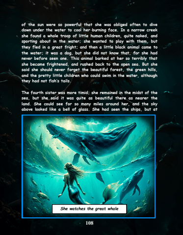 108of the sun were so powerful that she was obliged often to dive down under the water to cool her burning face. In a narrow creek she found a whole troop of little human children, quite naked, and sporting about in the water; she wanted to play with them, but they fled in a great fright; and then a little black animal came to the water; it was a dog, but she did not know that, for she had never before seen one. This animal barked at her so terribly that she became frightened, and rushed back to the open sea. But she said she should never forget the beautiful forest, the green hills, and the pretty little children who could swim in the water, although they had not fish%u2019s tails.The fourth sister was more timid; she remained in the midst of the sea, but she said it was quite as beautiful there as nearer the land. She could see for so many miles around her, and the sky above looked like a bell of glass. She had seen the ships, but at She watches the great whale