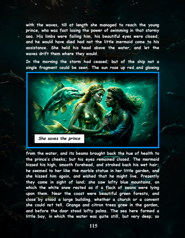 115with the waves, till at length she managed to reach the young prince, who was fast losing the power of swimming in that stormy sea. His limbs were failing him, his beautiful eyes were closed, and he would have died had not the little mermaid come to his assistance. She held his head above the water, and let the waves drift them where they would.In the morning the storm had ceased; but of the ship not a single fragment could be seen. The sun rose up red and glowing from the water, and its beams brought back the hue of health to the prince%u2019s cheeks; but his eyes remained closed. The mermaid kissed his high, smooth forehead, and stroked back his wet hair; he seemed to her like the marble statue in her little garden, and she kissed him again, and wished that he might live. Presently they came in sight of land; she saw lofty blue mountains, on which the white snow rested as if a flock of swans were lying upon them. Near the coast were beautiful green forests, and close by stood a large building, whether a church or a convent she could not tell. Orange and citron trees grew in the garden, and before the door stood lofty palms. The sea here formed a little bay, in which the water was quite still, but very deep; so She saves the prince