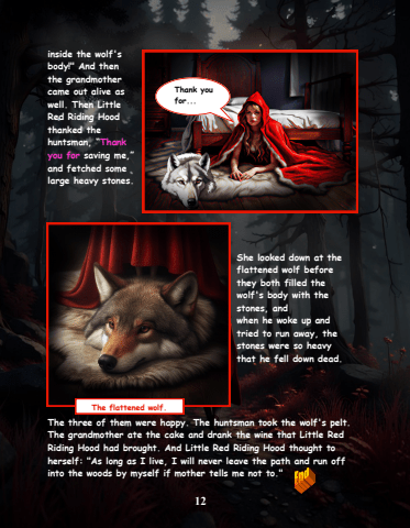 12inside the wolf's body!\the grandmother came out alive as well. Then Little Red Riding Hood thanked the huntsman, %u201cThank you for saving me,%u201d and fetched some large heavy stones.She looked down at the flattened wolf before they both filled the wolf's body with the stones, and when he woke up and tried to run away, the stones were so heavy that he fell down dead. The three of them were happy. The huntsman took the wolf's pelt. The grandmother ate the cake and drank the wine that Little Red Riding Hood had brought. And Little Red Riding Hood thought to herself: \into the woods by myself if mother tells me not to.\Thank you for...The flattened wolf.