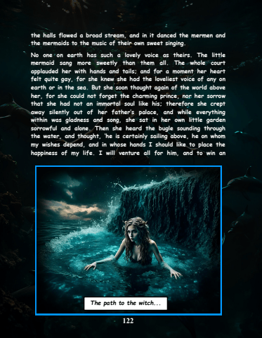 122the halls flowed a broad stream, and in it danced the mermen and the mermaids to the music of their own sweet singing. No one on earth has such a lovely voice as theirs. The little mermaid sang more sweetly than them all. The whole court applauded her with hands and tails; and for a moment her heart felt quite gay, for she knew she had the loveliest voice of any on earth or in the sea. But she soon thought again of the world above her, for she could not forget the charming prince, nor her sorrow that she had not an immortal soul like his; therefore she crept away silently out of her father%u2019s palace, and while everything within was gladness and song, she sat in her own little garden sorrowful and alone. Then she heard the bugle sounding through the water, and thought, %u2018he is certainly sailing above, he on whom my wishes depend, and in whose hands I should like to place the happiness of my life. I will venture all for him, and to win an The path to the witch...
