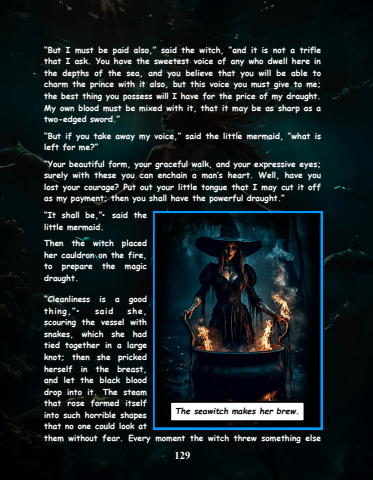 129%u201cBut I must be paid also,%u201d said the witch, %u201cand it is not a trifle that I ask. You have the sweetest voice of any who dwell here in the depths of the sea, and you believe that you will be able to charm the prince with it also, but this voice you must give to me; the best thing you possess will I have for the price of my draught. My own blood must be mixed with it, that it may be as sharp as a two-edged sword.%u201d%u201cBut if you take away my voice,%u201d said the little mermaid, %u201cwhat is left for me?%u201d%u201cYour beautiful form, your graceful walk, and your expressive eyes; surely with these you can enchain a man%u2019s heart. Well, have you lost your courage? Put out your little tongue that I may cut it off as my payment; then you shall have the powerful draught.%u201d%u201cIt shall be,%u201d%u2022 said the little mermaid.Then the witch placed her cauldron on the fire, to prepare the magic draught.%u201cCleanliness is a good thing,%u201d%u2022 said she, scouring the vessel with snakes, which she had tied together in a large knot; then she pricked herself in the breast, and let the black blood drop into it. The steam that rose formed itself into such horrible shapes that no one could look at them without fear. Every moment the witch threw something else The seawitch makes her brew.