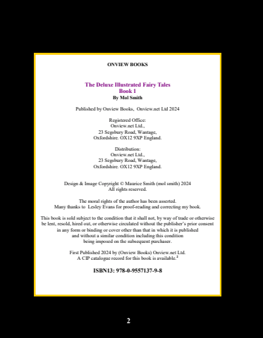 ONVIEW BOOKSThe Deluxe Illustrated Fairy TalesBook 1By Mol SmithPublished by Onview Books, Onview.net Ltd 2024Registered Office:Onview.net Ltd., 23 Segsbury Road, Wantage,Oxfordshire. OX12 9XP England.Distribution:Onview.net Ltd., 23 Segsbury Road, Wantage,Oxfordshire. OX12 9XP England.Design & Image Copyright %u00a9 Maurice Smith (mol smith) 2024All rights reserved.The moral rights of the author has been asserted.Many thanks to Lesley Evans for proof-reading and correcting my book.This book is sold subject to the condition that it shall not, by way of trade or otherwisebe lent, resold, hired out, or otherwise circulated without the publisher%u2019s prior consentin any form or binding or cover other than that in which it is published and without a similar condition including this conditionbeing imposed on the subsequent purchaser.First Published 2024 by (Onview Books) Onview.net Ltd.A CIP catalogue record for this book is available.2ISBN13: 978-0-9557137-9-82