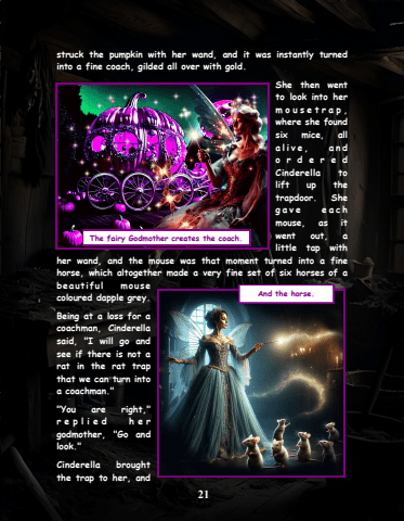 21struck the pumpkin with her wand, and it was instantly turned into a fine coach, gilded all over with gold.She then went to look into her m o u s e t r a p , where she found six mice, all a l i v e , a n d o r d e r e d Cinderella to lift up the trapdoor. She g a v e e a c h mouse, as it went out, a little tap with her wand, and the mouse was that moment turned into a fine horse, which altogether made a very fine set of six horses of a b e a uti f ul m o us e coloured dapple grey.Being at a loss for a coachman, Cinderella said, \see if there is not a rat in the rat trap that we can turn into a coachman.\\are right,\r e p l i e d h e r godmother, \look.\Cinderella brought the trap to her, and The fairy Godmother creates the coach.And the horse.