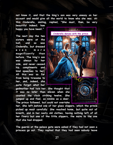 27not know it, and that the king's son was very uneasy on her account and would give all the world to know who she was. At this Cinderella, smiling, replied, \beautiful indeed; how happy you have been!.%u201d The next day the two sisters were at the ball, and so was Cinderella, but dressed e v e n m o r e magnificently than before. The king's son was always by her side, and never ceased his compliments and kind speeches to her. All this was so far from being tiresome to her, and, indeed, she quite forgot what her godmother had told her. She thought that it was no later than eleven when she counted the clock striking twelve. She jumped up and fled, as nimble as a deer. The prince followed, but could not overtake her. She left behind one of her glass slippers, which the prince picked up most carefully. She reached home, but quite out of breath, and in her nasty old clothes, having nothing left of all her finery but one of the little slippers, the mate to the one that she had dropped.The guards at the palace gate were asked if they had not seen a princess go out. They replied that they had seen nobody leave Cinderella dances with the prince.