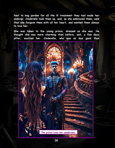 feet to beg pardon for all the ill treatment they had made her undergo. Cinderella took them up, and, as she embraced them, said that she forgave them with all her heart, and wanted them always to love her.She was taken to the young prince, dressed as she was. He thought she was more charming than before, and, a few days after, married her. Cinderella, who was no less good than 30The prince loves her unadorned.