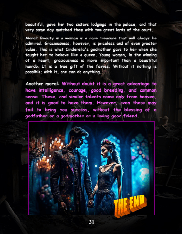 31beautiful, gave her two sisters lodgings in the palace, and that very same day matched them with two great lords of the court.Moral: Beauty in a woman is a rare treasure that will always be admired. Graciousness, however, is priceless and of even greater value. This is what Cinderella's godmother gave to her when she taught her to behave like a queen. Young women, in the winning of a heart, graciousness is more important than a beautiful hairdo. It is a true gift of the fairies. Without it nothing is possible; with it, one can do anything.Another moral: Without doubt it is a great advantage to have intelligence, courage, good breeding, and common sense. These, and similar talents come only from heaven, and it is good to have them. However, even these may fail to bring you success, without the blessing of a godfather or a godmother or a loving good friend.