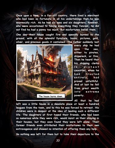 33Once upon a time, in a far-off country, there lived a merchant who had been so fortunate in all his undertakings that he was enormously rich. As he had six sons and six daughters, however, who were accustomed to having everything they fancied, he did not find he had a penny too much. But misfortunes befell them.One day their house caught fire and speedily burned to the ground, with all the splendid furniture, books, pictures, gold, silver, and precious goods it contained. The father suddenly lost every ship he had upon the sea, either to pirates, shipwreck, or fire. Then he heard that his shipping clerks i n d i s t a n t countries, whom he h a d t r u s t e d e n t i r e l y , h a d proved unfaithful. And at last he fell from great wealth i n t o e x t r e m e poverty.All that he had left was a little house in a desolate place at least a hundred leagues from the town, and to this he was forced to retreat. His children were in despair at the idea of leading such a different life. The daughters at first hoped their friends, who had been so numerous while they were rich, would insist on their staying in their houses, but they soon found they were left alone. Their former friends even attributed their misfortunes to their own extravagance and showed no intention of offering them any help.So nothing was left for them but to take their departure to the The house burns down.