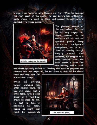 37orange trees, covered with flowers and fruit. When he reached the first court of the castle, he saw before him a flight of agate steps. He went up them and passed through several splendidly furnished rooms.The pleasant warmth of the air revived him, and he felt very hungry; but there seemed to be nobody in all this vast and splendid palace. Deep s i l e n c e r e i g n e d everywhere, and at last, tired of roaming through e m p t y r o o m s a n d galleries, he stopped in a room smaller than the rest, where a clear fire was burning, and a couch was drawn up cosily before it. Thinking this must be prepared for someone who was expected, he sat down to wait till he should come and very soon fell into a sweet sleep.When his extreme hunger wakened him after several hours, he was still alone; but a little table, with a good dinner on it, had been drawn up close to him. He lost no time in beginning his meal, hoping he might soon thank his considerate He falls asleep in the castle.He eats the food.
