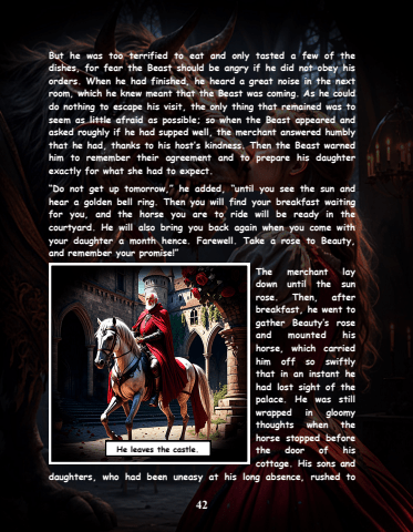 42But he was too terrified to eat and only tasted a few of the dishes, for fear the Beast should be angry if he did not obey his orders. When he had finished, he heard a great noise in the next room, which he knew meant that the Beast was coming. As he could do nothing to escape his visit, the only thing that remained was to seem as little afraid as possible; so when the Beast appeared and asked roughly if he had supped well, the merchant answered humbly that he had, thanks to his host%u2019s kindness. Then the Beast warned him to remember their agreement and to prepare his daughter exactly for what she had to expect.%u201cDo not get up tomorrow,%u201d he added, %u201cuntil you see the sun and hear a golden bell ring. Then you will find your breakfast waiting for you, and the horse you are to ride will be ready in the courtyard. He will also bring you back again when you come with your daughter a month hence. Farewell. Take a rose to Beauty, and remember your promise!%u201dThe merchant lay down until the sun rose. Then, after breakfast, he went to gather Beauty%u2019s rose and mounted his horse, which carried him off so swiftly that in an instant he had lost sight of the palace. He was still wrapped in gloomy thoughts when the horse stopped before the door of his cottage. His sons and daughters, who had been uneasy at his long absence, rushed to He leaves the castle.
