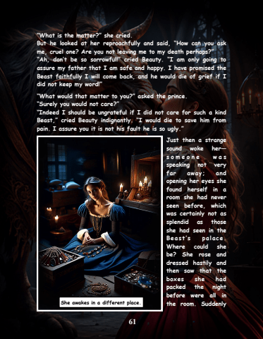 61%u201cWhat is the matter?%u201d she cried.But he looked at her reproachfully and said, %u201cHow can you ask me, cruel one? Are you not leaving me to my death perhaps?%u201d%u201cAh, don%u2019t be so sorrowful!%u201d cried Beauty. %u201cI am only going to assure my father that I am safe and happy. I have promised the Beast faithfully I will come back, and he would die of grief if I did not keep my word!%u201d%u201cWhat would that matter to you?%u201d asked the prince.%u201cSurely you would not care?%u201d%u201cIndeed I should be ungrateful if I did not care for such a kind Beast,%u201d cried Beauty indignantly. %u201cI would die to save him from pain. I assure you it is not his fault he is so ugly.%u201dJust then a strange sound woke her%u2014s o m e o n e w a s speaking not very far away; and opening her eyes she found herself in a room she had never seen before, which was certainly not as splendid as those she had seen in the B e as t %u2019s p al a c e . Where could she be? She rose and dressed hastily and then saw that the boxes she had packed the night before were all in She awakes in a different place. the room. Suddenly