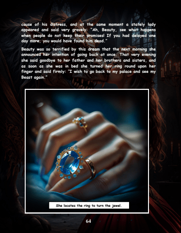 64cause of his distress, and at the same moment a stately lady appeared and said very gravely: %u201cAh, Beauty, see what happens when people do not keep their promises! If you had delayed one day more, you would have found him dead.%u201dBeauty was so terrified by this dream that the next morning she announced her intention of going back at once. That very evening she said goodbye to her father and her brothers and sisters, and as soon as she was in bed she turned her ring round upon her finger and said firmly: %u201cI wish to go back to my palace and see my Beast again.%u201d She locates the ring to turn the jewel.