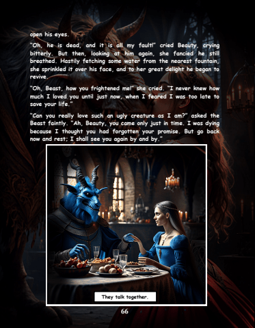 66open his eyes.%u201cOh, he is dead, and it is all my fault!%u201d cried Beauty, crying bitterly. But then, looking at him again, she fancied he still breathed. Hastily fetching some water from the nearest fountain, she sprinkled it over his face, and to her great delight he began to revive.%u201cOh, Beast, how you frightened me!%u201d she cried. %u201cI never knew how much I loved you until just now, when I feared I was too late to save your life.%u201d%u201cCan you really love such an ugly creature as I am?%u201d asked the Beast faintly. %u201cAh, Beauty, you came only just in time. I was dying because I thought you had forgotten your promise. But go back now and rest; I shall see you again by and by.%u201dThey talk together.