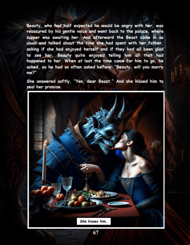 67Beauty, who had half expected he would be angry with her, was reassured by his gentle voice and went back to the palace, where supper was awaiting her. And afterward the Beast came in as usual and talked about the time she had spent with her father, asking if she had enjoyed herself and if they had all been glad to see her. Beauty quite enjoyed telling him all that had happened to her. When at last the time came for him to go, he asked, as he had so often asked before: %u201cBeauty, will you marry me?%u201dShe answered softly, %u201cYes, dear Beast.%u201d And she kissed him to seal her promise. She kisses him.