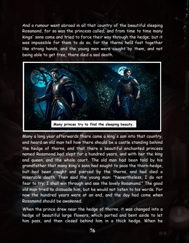 76And a rumour went abroad in all that country of the beautiful sleeping Rosamond, for so was the princess called; and from time to time many kings' sons came and tried to force their way through the hedge; but it was impossible for them to do so, for the thorns held fast together like strong hands, and the young men were caught by them, and not being able to get free, there died a sad death.Many a long year afterwards there came a king's son into that country, and heard an old man tell how there should be a castle standing behind the hedge of thorns, and that there a beautiful enchanted princess named Rosamond had slept for a hundred years, and with her the king and queen, and the whole court. The old man had been told by his grandfather that many king's sons had sought to pass the thorn-hedge, but had been caught and pierced by the thorns, and had died a miserable death. Then said the young man: \fear to try; I shall win through and see the lovely Rosamond.\old man tried to dissuade him, but he would not listen to his words. For now the hundred years were at an end, and the day had come when Rosamond should be awakened. When the prince drew near the hedge of thorns, it was changed into a hedge of beautiful large flowers, which parted and bent aside to let him pass, and then closed behind him in a thick hedge. When he Many princes try to find the sleeping beauty.