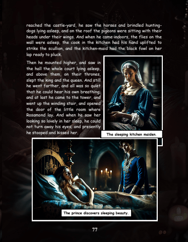77reached the castle-yard, he saw the horses and brindled huntingdogs lying asleep, and on the roof the pigeons were sitting with their heads under their wings. And when he came indoors, the flies on the wall were asleep, the cook in the kitchen had his hand uplifted to strike the scullion, and the kitchen-maid had the black fowl on her lap ready to pluck.Then he mounted higher, and saw in the hall the whole court lying asleep, and above them, on their thrones, slept the king and the queen. And still he went farther, and all was so quiet that he could hear his own breathing; and at last he came to the tower, and went up the winding stair, and opened the door of the little room where Rosamond lay. And when he saw her looking so lovely in her sleep, he could not turn away his eyes; and presently he stooped and kissed her. The sleeping kitchen maiden.The prince discovers sleeping beauty.
