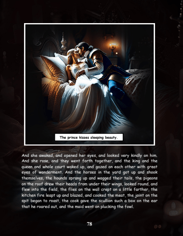 78And she awaked, and opened her eyes, and looked very kindly on him. And she rose, and they went forth together, and the king and the queen and whole court waked up, and gazed on each other with great eyes of wonderment. And the horses in the yard got up and shook themselves, the hounds sprang up and wagged their tails, the pigeons on the roof drew their heads from under their wings, looked round, and flew into the field, the flies on the wall crept on a little farther, the kitchen fire leapt up and blazed, and cooked the meat, the joint on the spit began to roast, the cook gave the scullion such a box on the ear that he roared out, and the maid went on plucking the fowl.The prince kisses sleeping beauty.