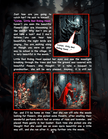 8Just how are you going to catch her? He said to himself. \haven't you seen the beautiful flowers that are blossoming in the woods? Why don't you go and take a look? And I don't believe you can hear how beautifully the night birds are singing. You are walking along as though you were on your way to school in the village. It is very beautiful in the woods.\Little Red Riding Hood opened her eyes and saw the moonlight breaking through the trees and how the ground was covered with beautiful flowers. She thought: %u2018If a take a bouquet to grandmother, she will be very pleased. Anyway, it is still not far, and I'll be home on time.%u2019 And she ran off into the woods looking for flowers. She picked some flowers, after smelling their wonderful perfume which had an aroma of rose and lavender, and placed them gently in her basket. Each time she picked one she thought that she could see an even more beautiful one a little way off, and she ran after it, going further into the woods.%u201cListen, little Red Riding Hood...%u201d