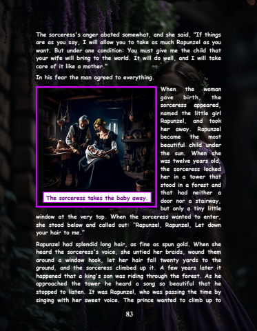 83The sorceress's anger abated somewhat, and she said, \are as you say, I will allow you to take as much Rapunzel as you want. But under one condition: You must give me the child that your wife will bring to the world. It will do well, and I will take care of it like a mother.\In his fear the man agreed to everything.When the woman gave birth, the sorceress appeared, named the little girl Rapunzel, and took her away. Rapunzel became the most beautiful child under the sun. When she was twelve years old, the sorceress locked her in a tower that stood in a forest and that had neither a door nor a stairway, but only a tiny little window at the very top. When the sorceress wanted to enter, she stood below and called out: %u201cRapunzel, Rapunzel, Let down your hair to me.%u201dRapunzel had splendid long hair, as fine as spun gold. When she heard the sorceress's voice, she untied her braids, wound them around a window hook, let her hair fall twenty yards to the ground, and the sorceress climbed up it. A few years later it happened that a king's son was riding through the forest. As he approached the tower he heard a song so beautiful that he stopped to listen. It was Rapunzel, who was passing the time by singing with her sweet voice. The prince wanted to climb up to The sorceress takes the baby away.