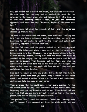 84her, and looked for a door in the tower, but none was to be found. He rode home, but the song had so touched his heart that he returned to the forest every day and listened to it. One time, as he was thus standing behind a tree, he saw the sorceress approach, and heard her say: %u201cRapunzel, Rapunzel, Let down your hair.%u201dThen Rapunzel let down her strands of hair, and the sorceress climbed up them to her. \luck,%u201d said the Prince to himself. And the next day, just as it was beginning to get dark, he went to the tower and called out: %u201cRapunzel, Rapunzel, Let down your hair.%u201dThe hair fell down, and the prince climbed up. At first Rapunzel was terribly frightened when a man such as she had never seen before came in to her. However, the prince began talking to her in a very friendly manner, telling her that his heart had been so touched by her singing that he could have no peace until he had seen her in person. Then Rapunzel lost her fear, and when he asked her if she would take him as her husband, she thought, \would rather have me than would old Frau Gothel.\and placed her hand into his.She said, \get down. Every time that you come, bring a strand of silk, from which I will weave a ladder. When it is finished I will climb down, and you can take me away on your horse.\They arranged that he would come to her every evening, for the old woman came by day. The sorceress did not notice what was happening until one day Rapunzel said to her, \why it is that you are more difficult to pull up than is the young prince, who will be arriving any moment now?\\you? I thought I had removed you from the whole world, but you