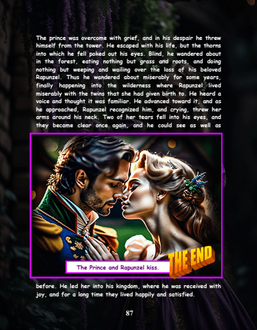 87The prince was overcome with grief, and in his despair he threw himself from the tower. He escaped with his life, but the thorns into which he fell poked out his eyes. Blind, he wandered about in the forest, eating nothing but grass and roots, and doing nothing but weeping and wailing over the loss of his beloved Rapunzel. Thus he wandered about miserably for some years, finally happening into the wilderness where Rapunzel lived miserably with the twins that she had given birth to. He heard a voice and thought it was familiar. He advanced toward it, and as he approached, Rapunzel recognized him, and crying, threw her arms around his neck. Two of her tears fell into his eyes, and they became clear once again, and he could see as well as before. He led her into his kingdom, where he was received with joy, and for a long time they lived happily and satisfied.The Prince and Rapunzel kiss.
