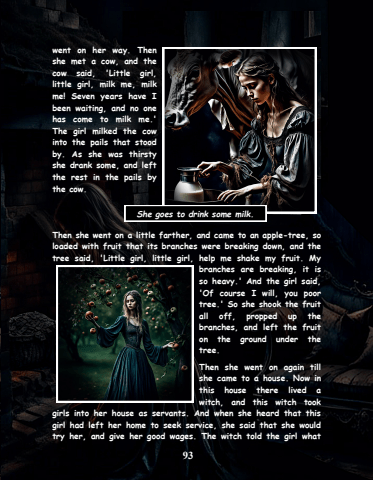 93went on her way. Then she met a cow, and the cow said, 'Little girl, little girl, milk me, milk me! Seven years have I been waiting, and no one has come to milk me.' The girl milked the cow into the pails that stood by. As she was thirsty she drank some, and left the rest in the pails by the cow. Then she went on a little farther, and came to an apple-tree, so loaded with fruit that its branches were breaking down, and the tree said, 'Little girl, little girl, help me shake my fruit. My branches are breaking, it is so heavy.' And the girl said, 'Of course I will, you poor tree.' So she shook the fruit all off, propped up the branches, and left the fruit on the ground under the tree. Then she went on again till she came to a house. Now in this house there lived a witch, and this witch took girls into her house as servants. And when she heard that this girl had left her home to seek service, she said that she would try her, and give her good wages. The witch told the girl what She goes to drink some milk.